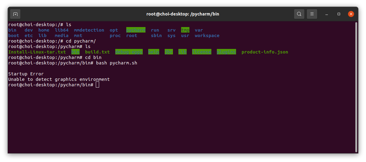 그 후 마운트된 파이참 폴더(/pycharm/bin/)에 가서 아래 명령어를 수행하면 정상적으로 pycharm이 실행됨을 볼 수 있다.