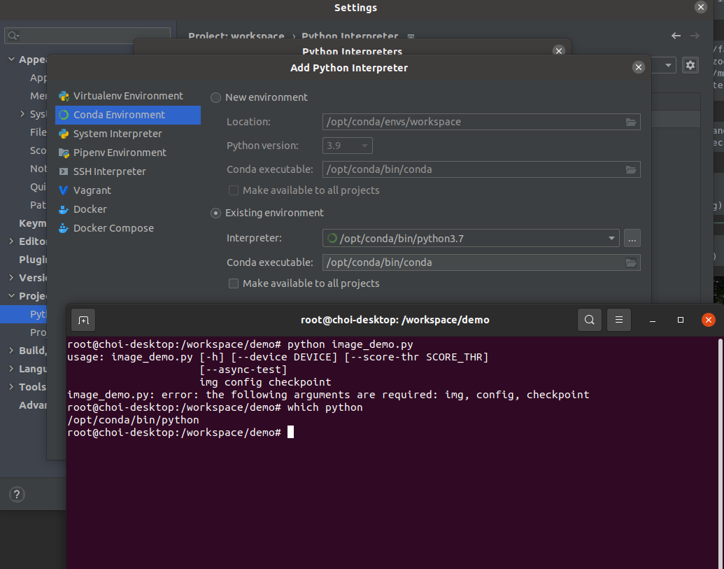 보니까 위 image_demo는 argument를 넣어줘야 해서 나중에 하고 변경하여 실행하고 있는 pycharm에서 inference_demo.ipynb를 실행