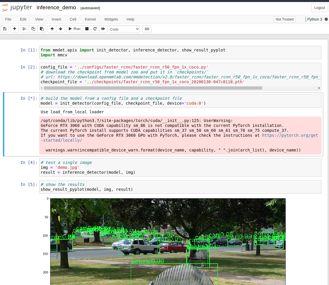python demo/image_demo.py demo/demo.jpg configs/faster_rcnn/faster_rcnn_r50_fpn_1x_coco.py checkpoints/faster_rcnn_r50_fpn_1x_coco_20200130-047c8118.pth --device cuda:0
